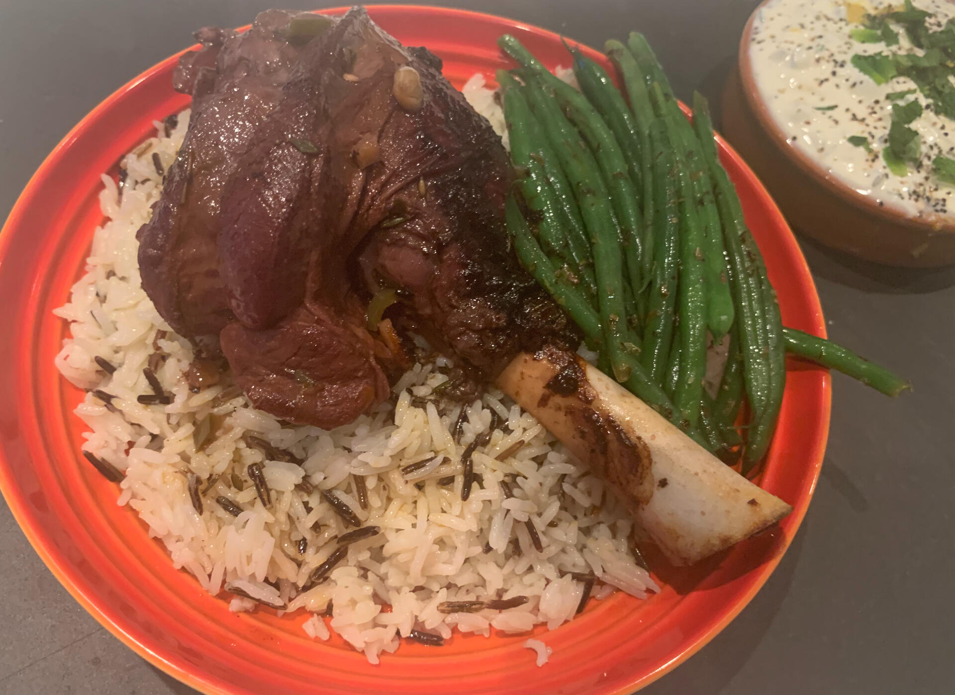 Remove the cooked meat from the oven and serve with mint leaves and the cooking juices spooned on top.