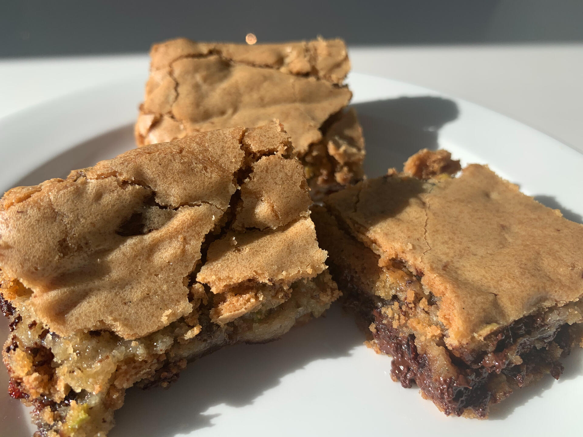 Spoon the batter into the baking tray, and cook for about 40mins. Bake until the blondies are light brown around the edges and a toothpick inserted in the middle comes out clean.