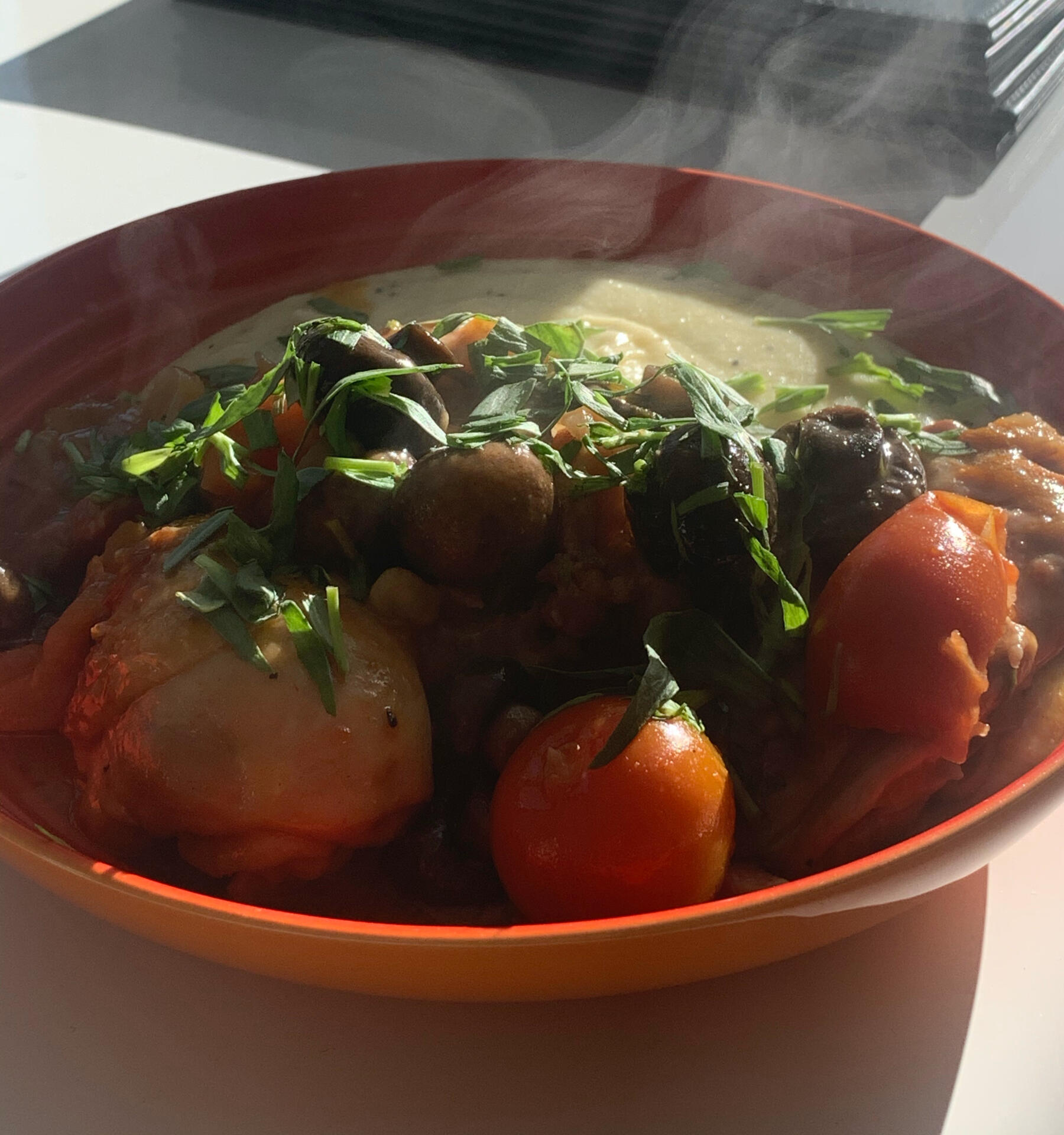 Add the stock, tomatoes and 1/2 of the tarragon.