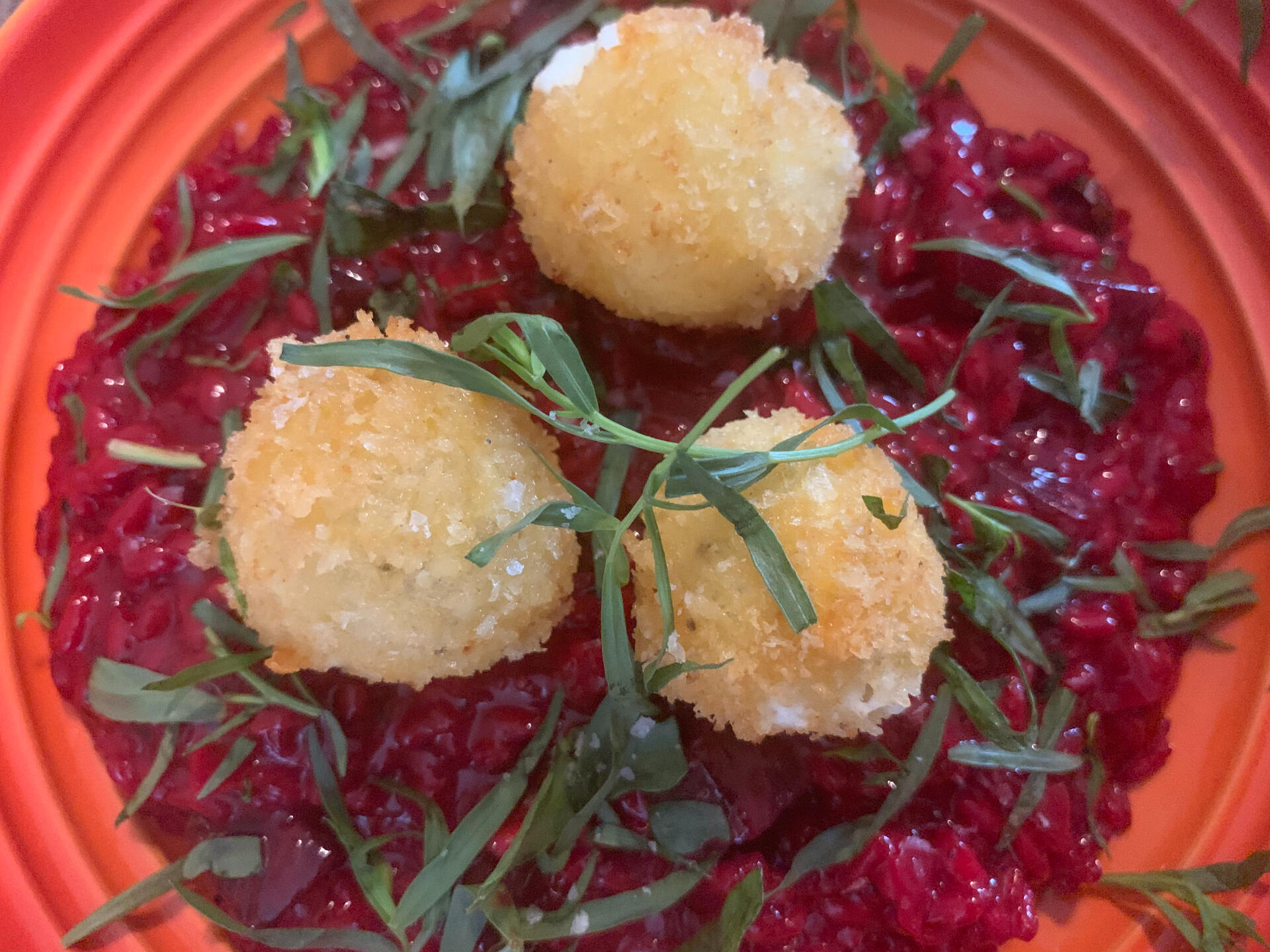 Finish with the deep fried goat’s cheese and garnish with the tarragon.