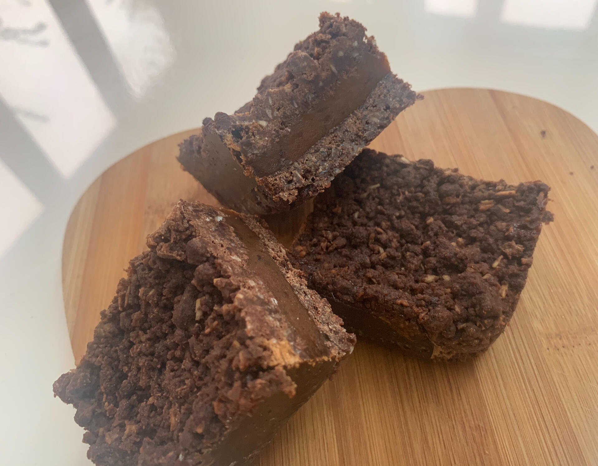 Mix together the flour, cocoa, desiccated coconut, sugar, melted butter and tsp vanilla. The mix should look like breadcrumbs.